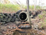 Tires armor outlet and bank. May be manmade sedimentation pool, boulders define it downstream. Boulder substrate downstream for about 50' then sand.