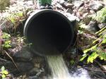 Additional culvert above and to left of outlet seems to be linked only to storm drain on road.; We had to estimate structure length.