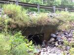 Road shoulder looks to be failing where concrete and metal culvert join; Outlet has metal culvert extension with a steep incline to junction with old culvert.