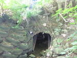 Fill: 1m. Cannot see through culvert at all, no light gets through. Could it be curved? Many old bricks downstream. The embankment on the inlet side is built up with tires.