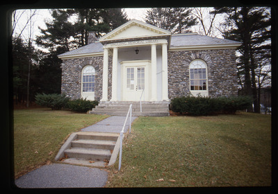 The Spaulding Memorial Library, in Sebago, Maine, boasts a handsome stone front and pillared doorway.