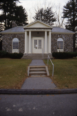 The Spaulding Memorial Library, in Sebago, Maine, boasts a handsome stone front and pillared doorway.