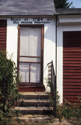 The sign over the door of the Library and Neighborhood House in East Sumner, Maine, reads, "Built in 1784 by Dea. Increase Robinson.