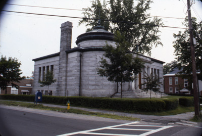 The noble façade of the Farmington Public Library in Farmington, Maine, stands against a gray sky.