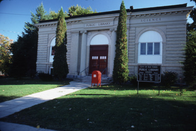 Tall shrubs stand at attention outside the Old Town Public Library in Old Town, Maine, seen here before its expansion.