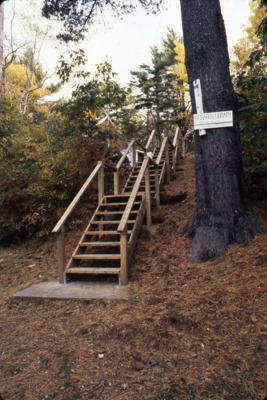 Wooden steps lead to the Laura E. Richards Library in Georgetown, Maine.