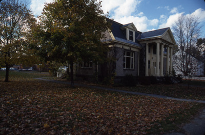 Autumnal trees surround the Baxter Memorial Library in Gorham, Maine.