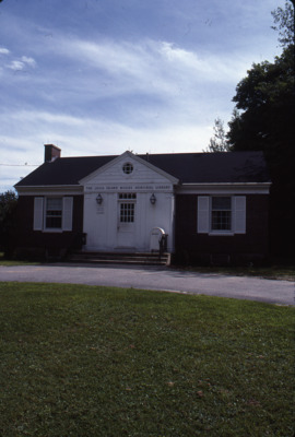 The Julia Adams Morse Memorial Library, in Greene, Maine, seen here before its expansion, sits near a neat plot of grass.