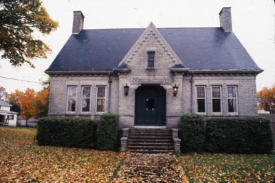 Autumn leaves strew the front yard of the Cary Library in Houlton, Maine.