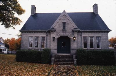 Autumn leaves strew the front yard of the Cary Library in Houlton, Maine.