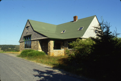 The stone and shingle bulk of the Revere Memorial Library sits in the sun on Isle au Haut, Maine.