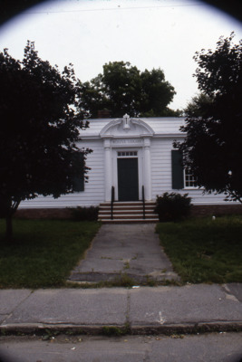 Leafy trees surround the Webster Library in Kingfield, Maine.