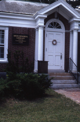 A rounded transom window tops the entranceway to the Davis Memorial Library in Limington, Maine.