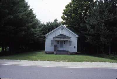 Leafy trees tower over the Livermore Public Library in Livermore, Maine.