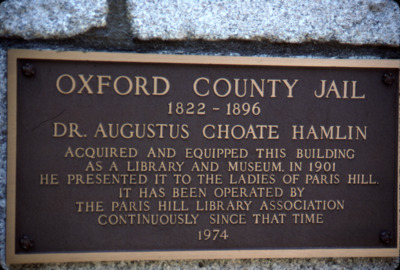 A sign outside the Hamlin Memorial Library & Museum, in Paris, Maine, reads, "Oxford County Jail 1822-1896. Dr. Augustus Choate Hamlin acquired and equipped this building as a library and museum. In 1901 he presented it to the ladies of Paris Hill. It has been operated by the Paris Hill Library Association continuously since that time. 1974."