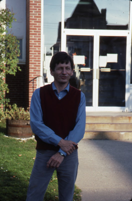 Librarian Charles (Chuck) Howell poses outside the Millinocket Memorial Library in Millinocket, Maine.