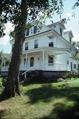 The Victorian splendor of the Naples Public Library, in Naples, Maine, sits among tall leafy trees.
