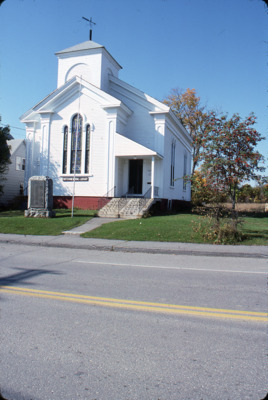A long stained glass window graces the front of the Veteran's Memorial Library in Patten, Maine.