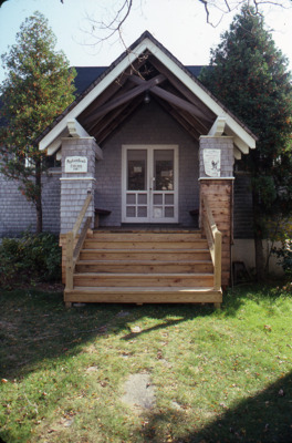 A peaked roof protects patrons as they enter the Popham Beach Library in Phippsburg, Maine.