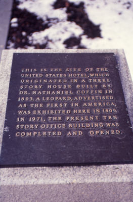 A plaque outside the Portland Public Library in Portland, Maine, reads, "This is the site of the United States Hotel, which originated in a three story house built by Dr. Nathaniel Coffin in 1803. A leopard, advertised as the first in America, was exhibited here in 1809. In 1971, the present ten story office building was completed and opened."