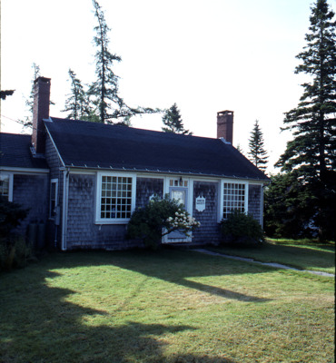 Tall pines surround the neat, shingled snugness of the Dorcas Library in Prospect Harbor, Maine.
