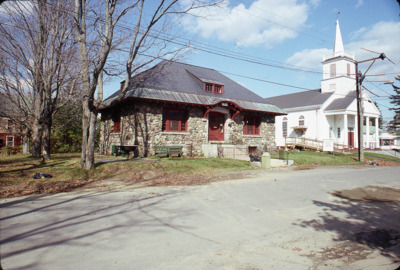 The Rangeley Public Library, in Rangeley, Maine, is located next to a church.