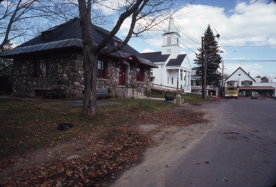 The Rangeley Public Library, in Rangeley, Maine, is located next to a church.