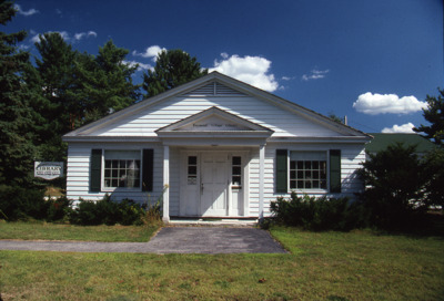 Leafy trees surround the Raymond Village Library in Raymond, Maine.