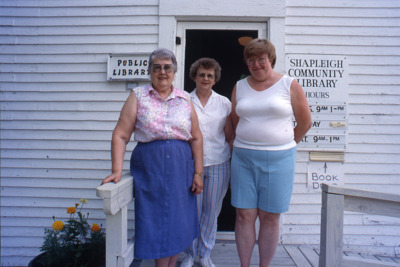 Three women, probably librarians, pose outside the Shapleigh Community Library in Shapleigh, Maine.