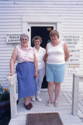 Three women, probably librarians, pose outside the Shapleigh Community Library in Shapleigh, Maine.
