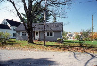 Autumn leaves strew the lawn at the Sherman Public Library in Sherman, Maine.