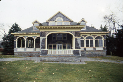 Bare trees frame the elegant shingled front of the Sorrento Public Library in Sorrento, Maine.