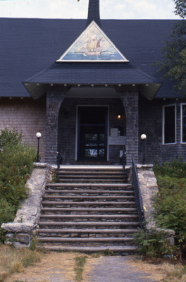 An elegant painting of a boat sits in a triangular area above the front door of the Squirrel Island Library on Squirrel Island, Maine.
