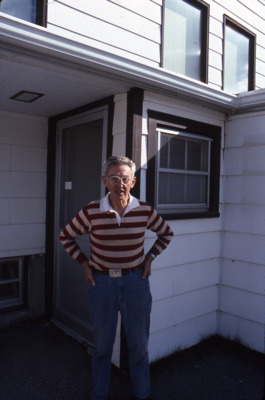 Librarian Jerome Hopson poses outside the former Stratton Public Library in Stratton, Maine.
