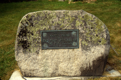 A plaque outside the former home of the Vinalhaven Public Library, in Vinalhaven, Maine, reads, "Dedicated to Martin Pring and to the first settlers of the Fox Islands 1603-1939."
