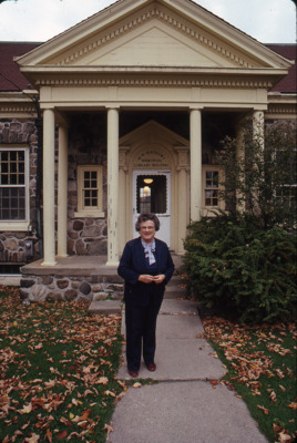 Librarian Eleanor Perkins stands in front of the Warren Free Public Library in Warren, Maine.