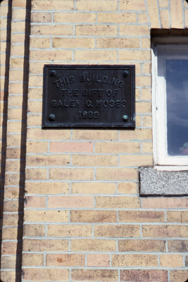 A plaque on the side of the Patten Free Library in Bath, Maine, reads, "This building the gift of Galen G. Moses 1889."