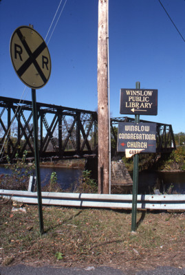 A sign indicates directions to the Winslow Public Library and the Winslow Congregational Church in Winslow, Maine.