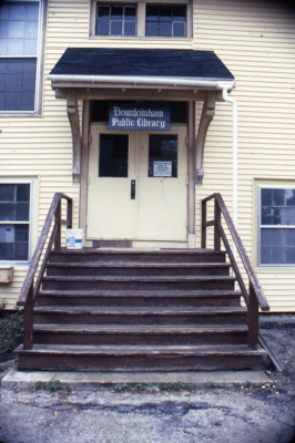 Wooden steps lead to the entrance of the Bowdoinham Public Library in Bowdoinham, Maine.