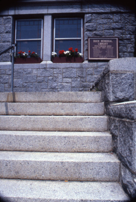 Wide stone steps lead to the entrance of the Buck Memorial Library in Bucksport, Maine.