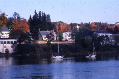 A sailboat glides past the Buck Memorial Library in Bucksport, Maine.