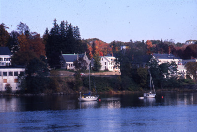 A sailboat glides past the Buck Memorial Library in Bucksport, Maine.