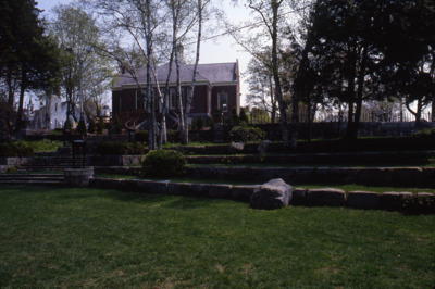 Formal plantings surround the Camden Public Library in Camden, Maine.