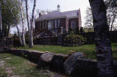 Formal plantings surround the Camden Public Library in Camden, Maine.