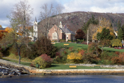 The Camden Public Library sits atop a lushly planted hillside in Camden, Maine.