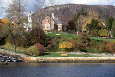The Camden Public Library sits atop a lushly planted hillside in Camden, Maine.