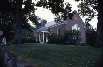 Tall leafy trees frame the Camden Public Library in Camden, Maine.
