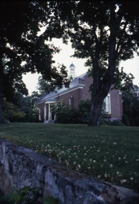Tall leafy trees frame the Camden Public Library in Camden, Maine.