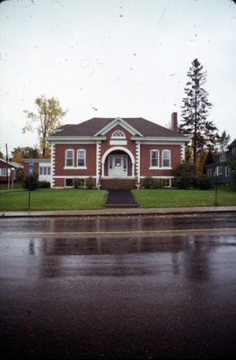 The Caribou Public Library stands in the rain in Caribou, Maine.
