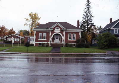 The Caribou Public Library stands in the rain in Caribou, Maine.